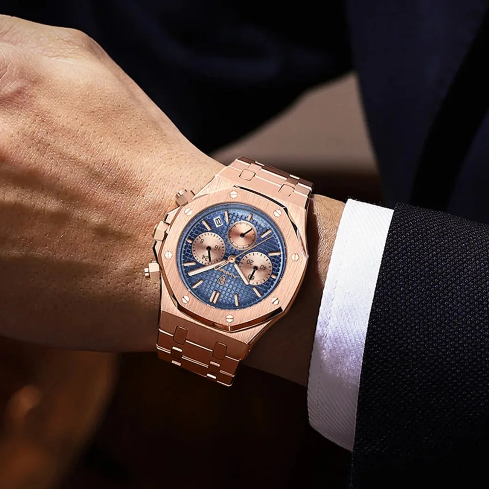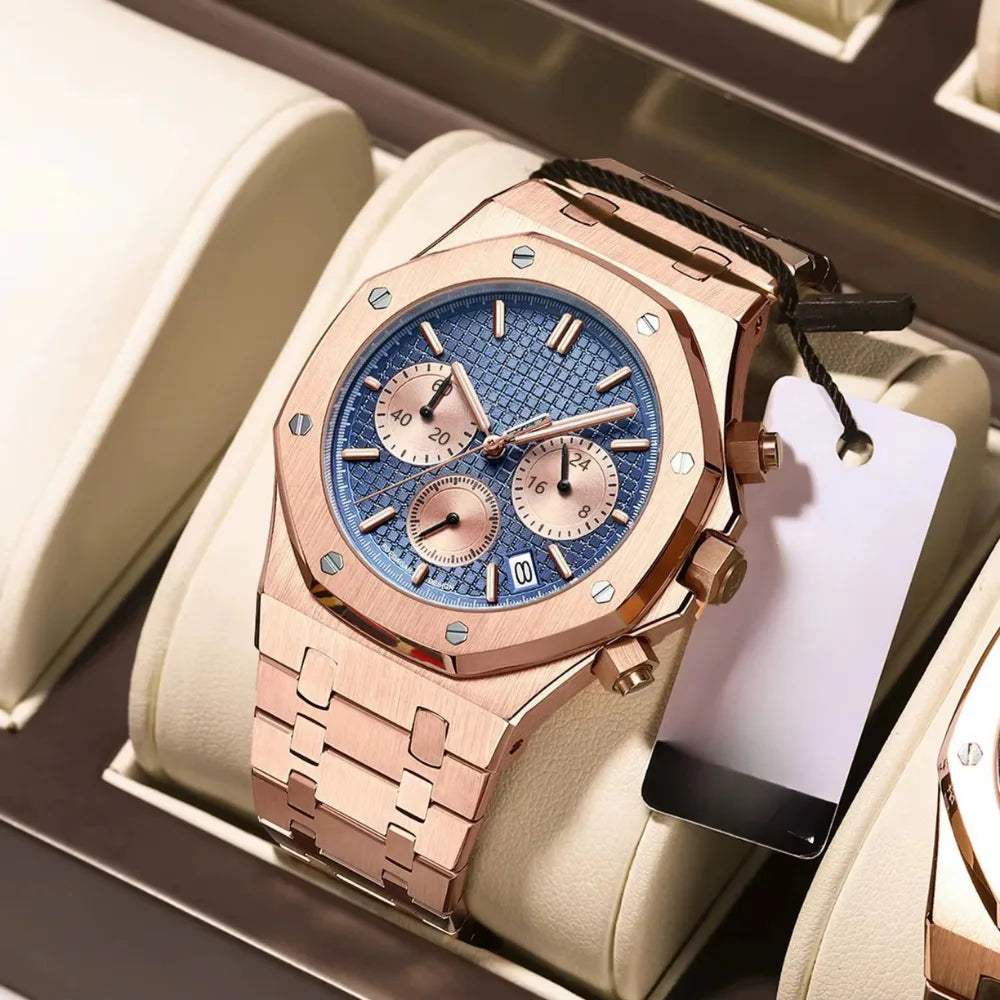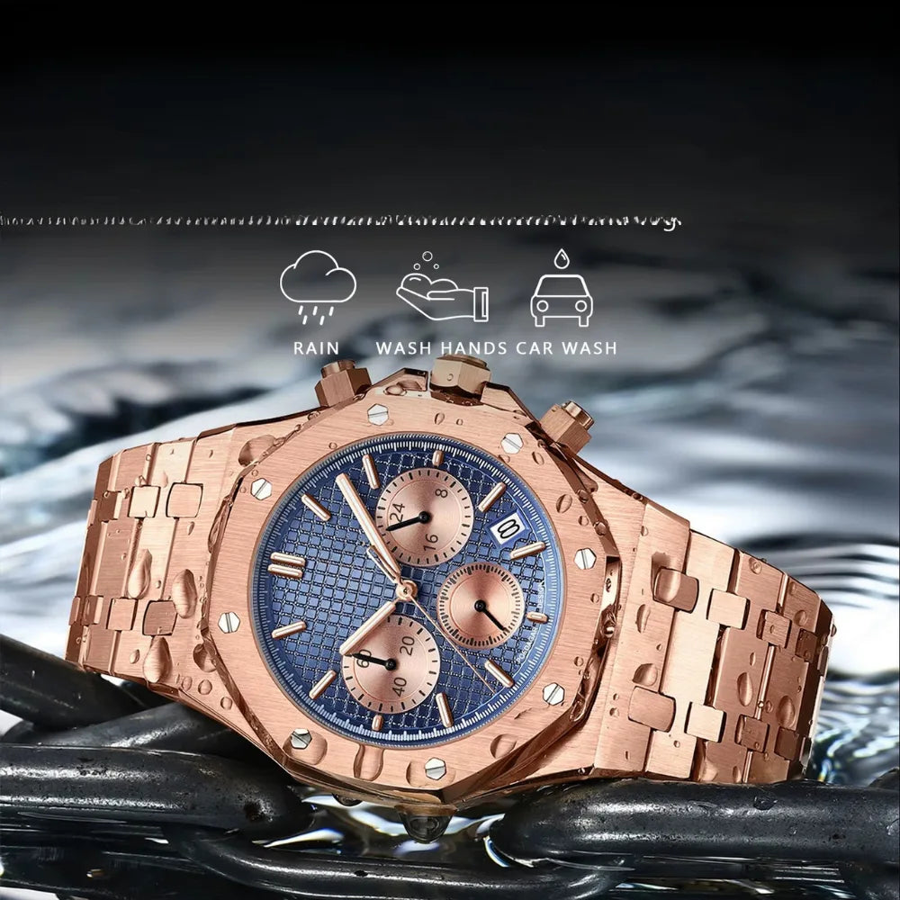 Equipado com cronógrafo funcional, calendário completo lua e ponteiros luminosos, o Golden Blue combina desempenho técnico com visual poderoso. A marcação precisa do tempo se transforma em um símbolo de disciplina e atitude.