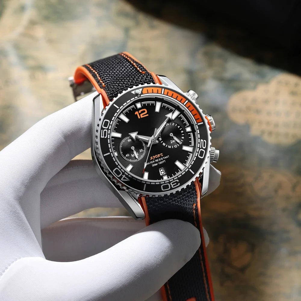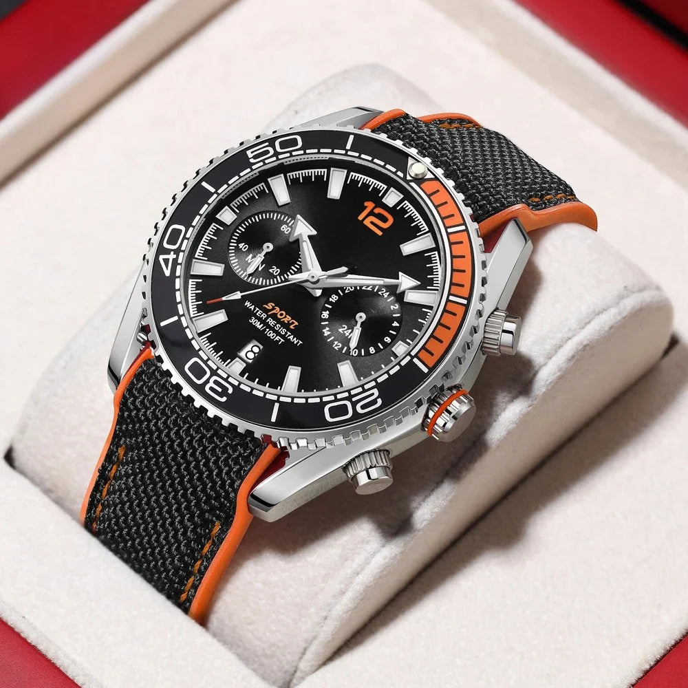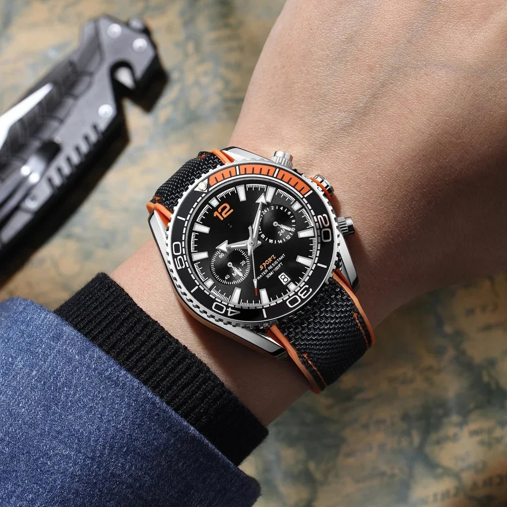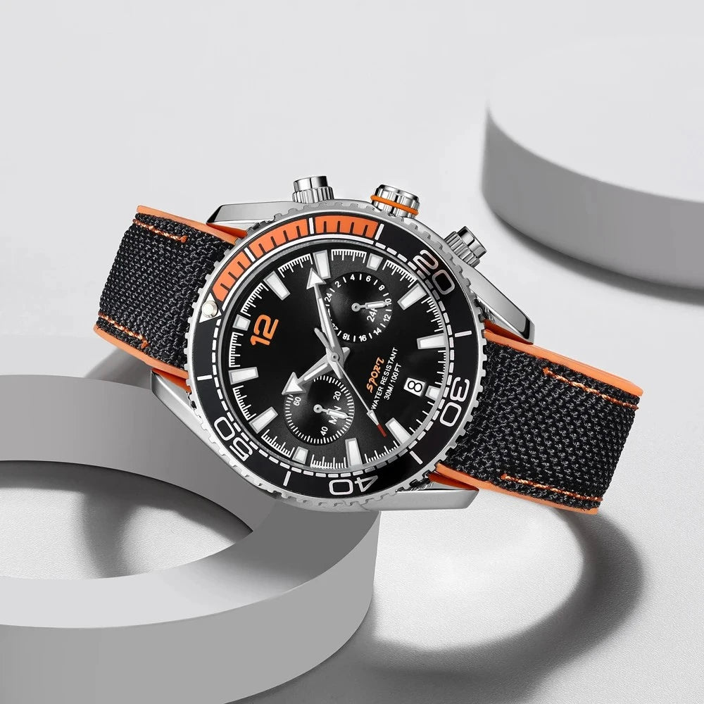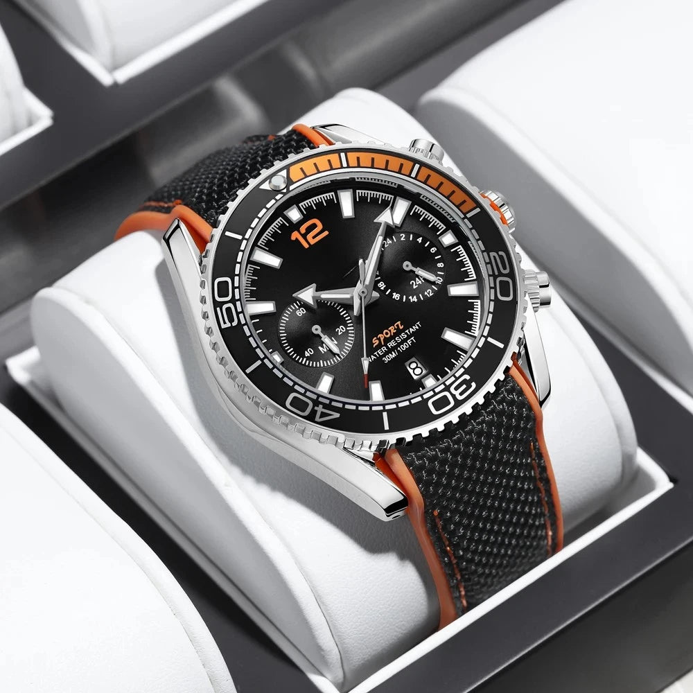 Equipado com cronógrafo funcional, calendário completo e ponteiros luminosos, o Sport Preto e Laranja combina desempenho técnico com visual poderoso. A marcação precisa do tempo se transforma em um símbolo de disciplina e atitude.